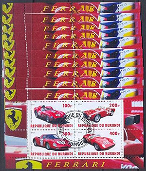 Deux feuillets semblables, l'un de quatre valeurs (150 F, 250F, 350F et 450F) et l'autre de deux valeurs (150 F et 250F) dans des formats ENP, FNP, FPPN et FPPB incorporant l'année 2009 illustrant différentes voitures Ferrari. Les deux feuillets portent en tête et en bas l'inscription en petits caractères «Ferrari». - 2 x 4 = 8 + 318 = 326