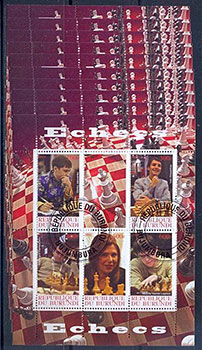Deux feuillets semblables, un de six valeurs (100 F, 150 F, 200F, 250F, 300F et 400F) et l'autre de 9 valeurs (100 F, 150 F, 200F, 250F, 300F, 350F, 400F, 450F et 500F) dans des formats ENP et FPPN incorporant le nom du pays comme REPUBLIQUE DU BURUNDI et qui auront été émis en 1999 - deux versions imprimées ont été trouvées du feuillet de 9 valeurs. Chaque feuillet illustre des jeux d'échecs et se trouve également dans un format surchargé en or avec l'inscription et le logo de la 33 e olympiade des échecs. Ces feuillets ont été également découverts affixés à des enveloppes premier jour, dans le format perforé et préoblitéré (EPJ-FPPN). – (1 x 4) + (1 x 3) = 7 + 255 = 262